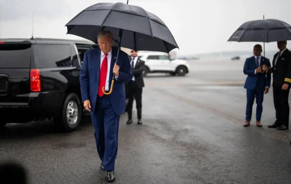 (记者问老特为何自己撑伞,老特回怼“我的手没断”)
